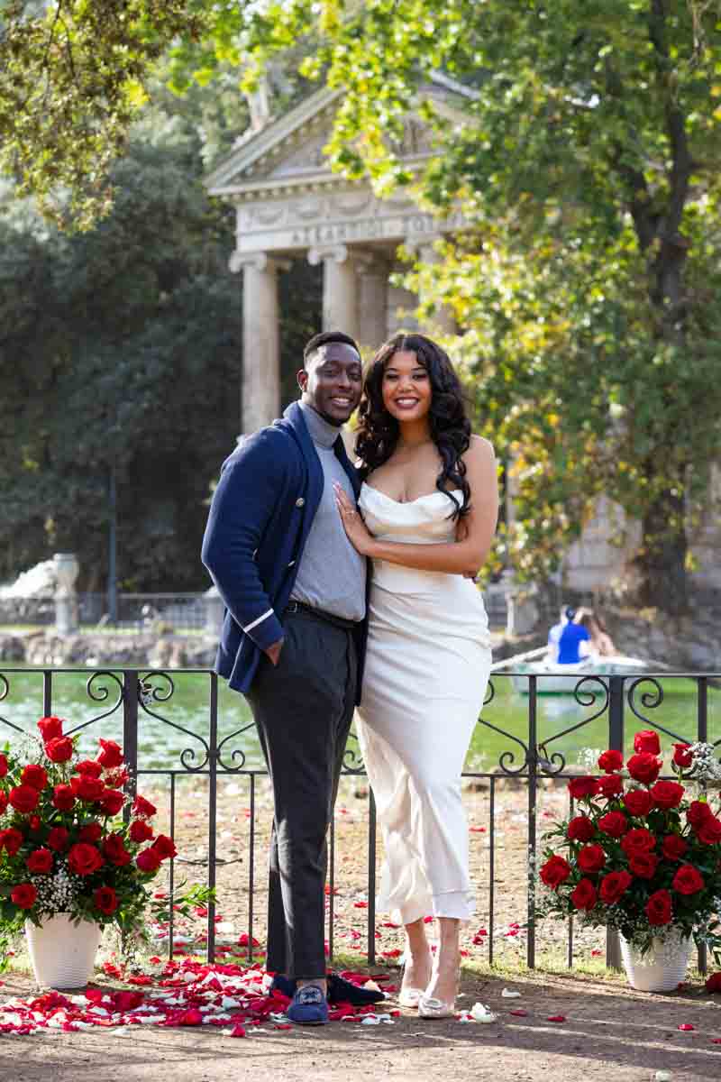 What a stunningly beautiful and Romantic Villa Borghese Proposal in Rome. Set up to take place by the lake with the background view of Temple of Asclepius. Surrounded by red roses and rose petals. A beautiful proposal candidly photographed and video recorded from a distance. A surprise which was welcomed with so much joy and happiness! The photographer, with skillful precision, immortalized this tender moment preserving it in unforgettable images.